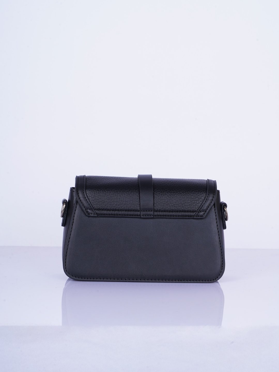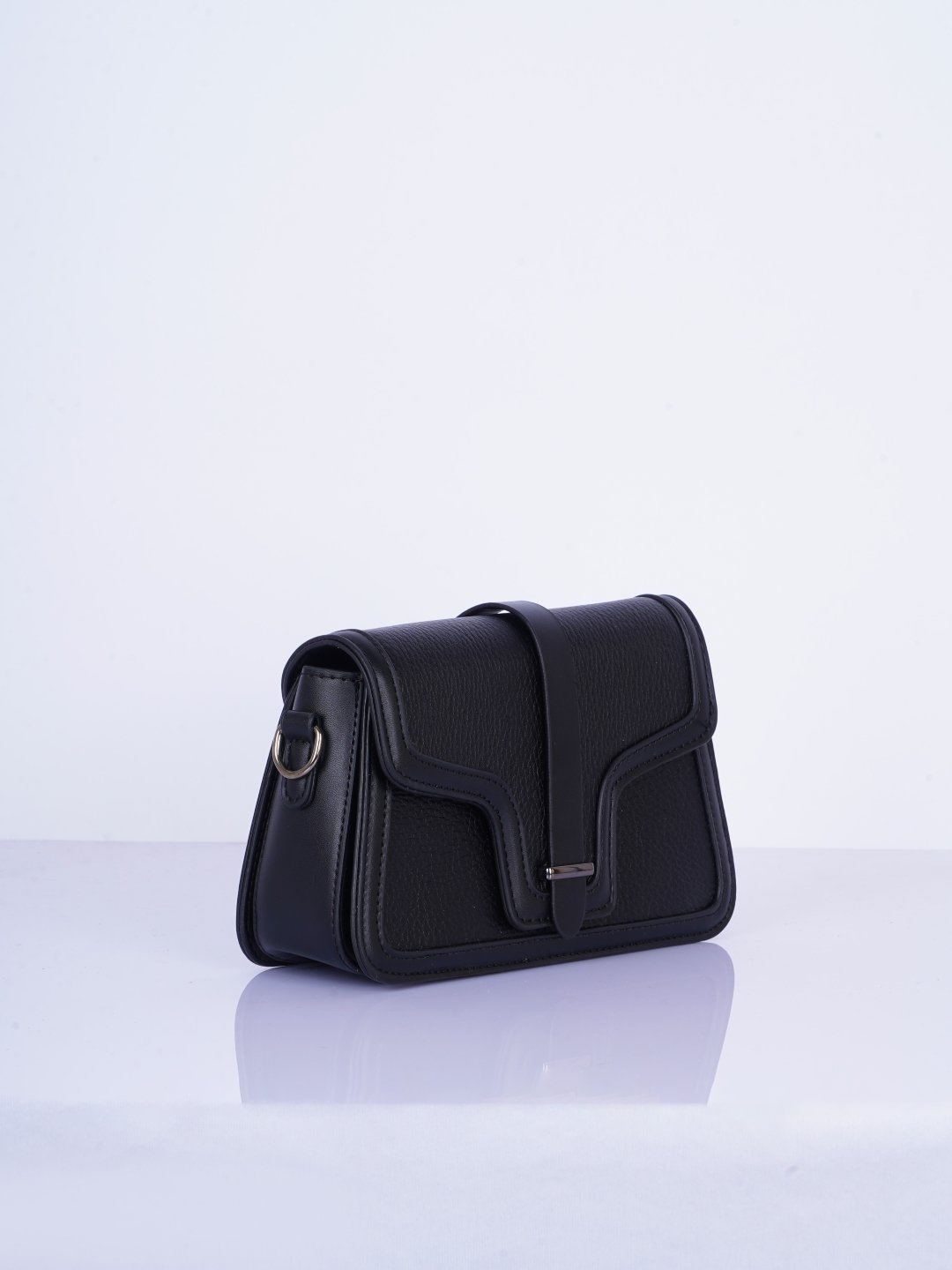 Black Swagger Sling Bag. This black solid sling bag features a main compartment with a button closure and an inner pocket, along with a detachable sling strap for added convenience. Made from durable PU material, it’s easy to maintain with simple cleaning using a dry cloth.