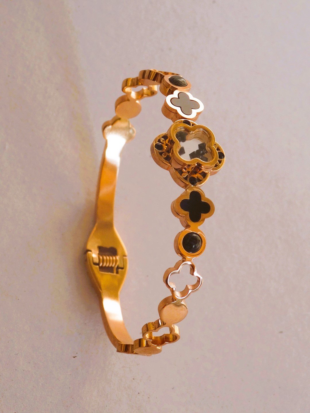 Clover design black stud bracelet (Clover moving crystals stud bracelet with spring open)